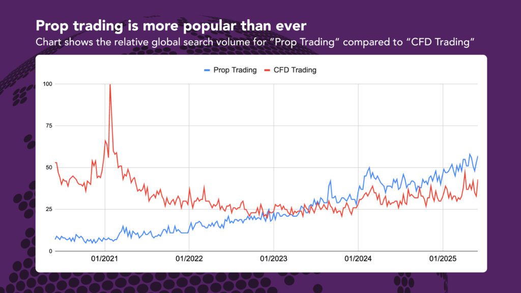 Globally, however, the prop trading boom continues unabated. Google search queries reached new record highs in 2025 and have long since surpassed interest in “CFD trading.” The appeal is particularly strong among younger traders: instead of having to commit €10,000 or more of their own capital, as is common in CFD trading, prop trading provides access to a so-called funded account. Those who pass a multi-stage challenge on demo accounts can trade with up to six-figure amounts of external capital.